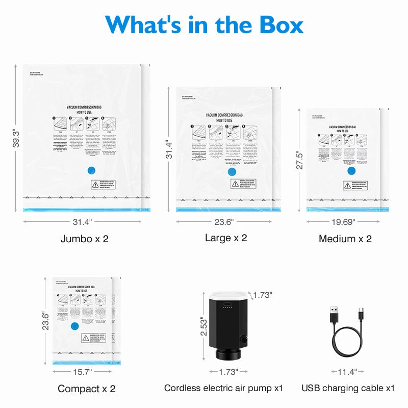 🔹 Includes a Powerful Rechargeable Air Pump: No need for bulky vacuum cleaners! The portable, rechargeable air pump makes compressing your storage bags quick and effortless, perfect for both home use and travel convenience.